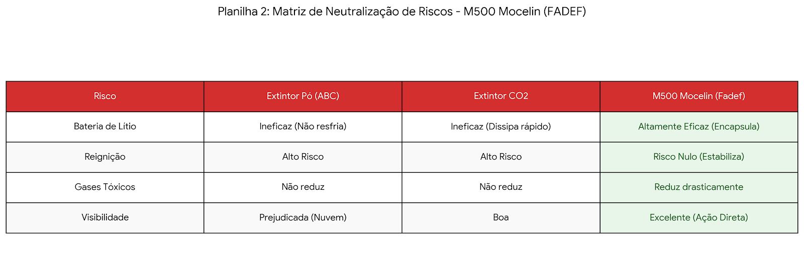 Ao proteger um Data Center, uma oficina de veículos elétricos ou um condomínio com estações de recarga, a escolha do agente extintor é uma decisão de gerenciamento de risco crítico. Esta planilha compara o desempenho do M500 frente aos extintores comuns, evidenciando sua superioridade em todos os quesitos de segurança.