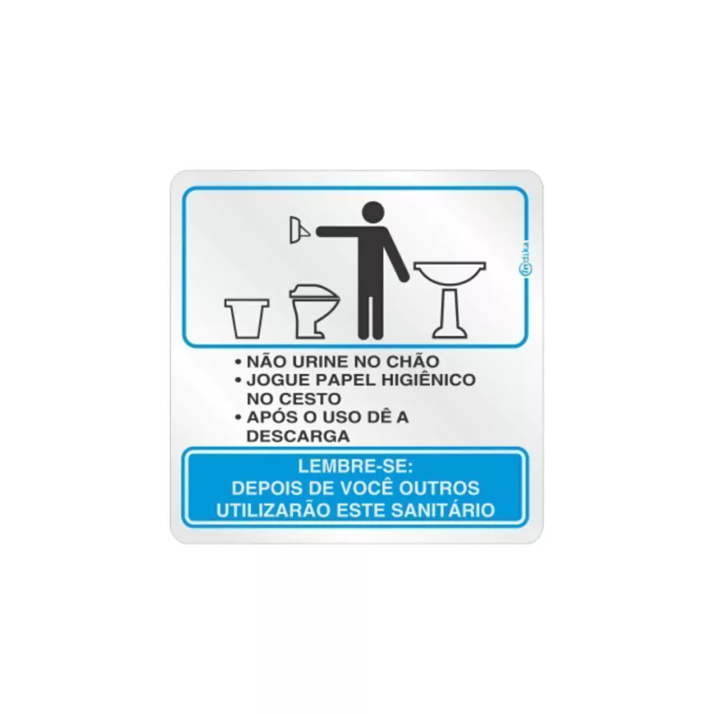 A placa traz instruções essenciais, como: - Não Urine no Chão - Jogue papel higiênico no cesto - Após o uso, dê a descarga - Lembre-se: depois de você, outros utilizarão este sanitário.