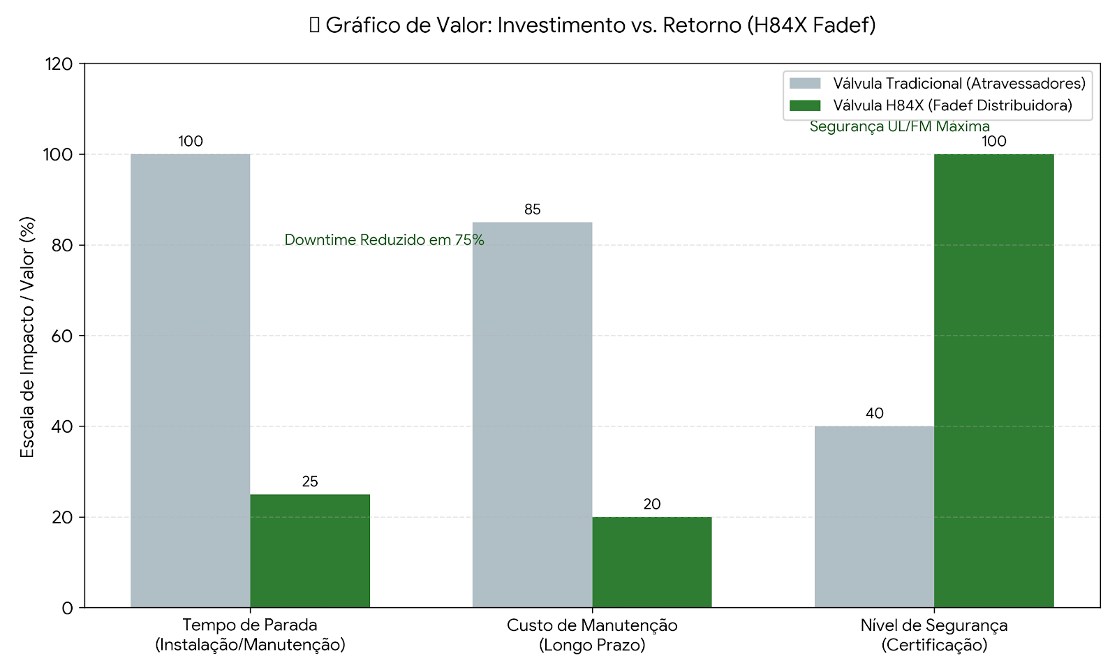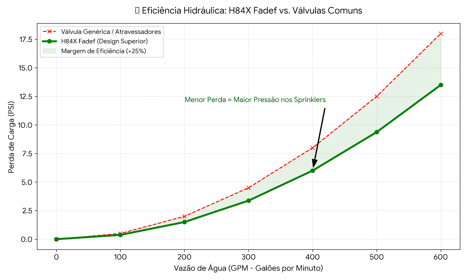 💡 Entenda a Vantagem: O gráfico de desempenho demonstra que a eficiência da nossa válvula é 25% superior. Na prática, isso garante que a pressão gerada pelas bombas de incêndio chegue integralmente aos hidrantes e sprinklers, garantindo que o sistema atue com força total em caso de necessidade.